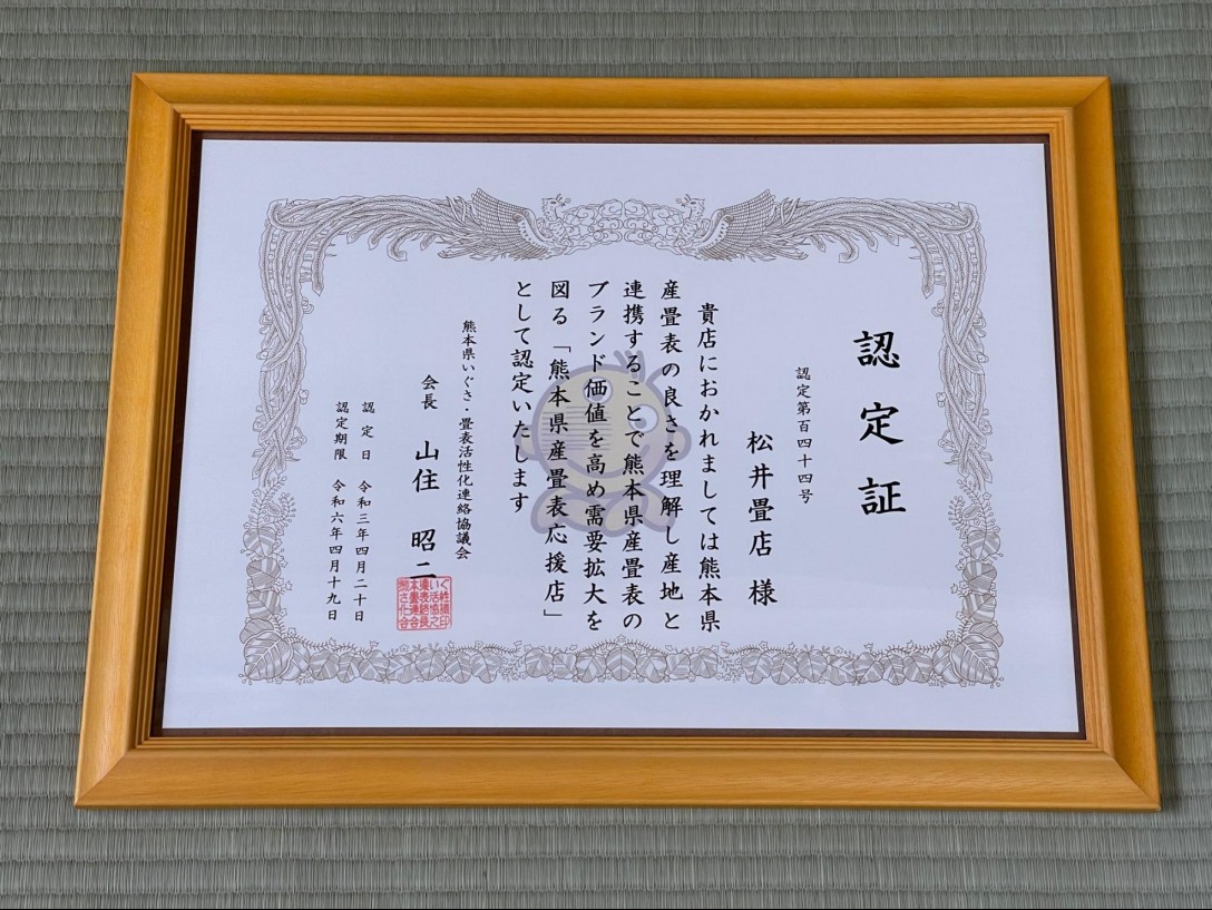 素晴らしい認定証を頂きましたので、引き続き、熊本県産畳表へこだわりを持って『応援店』として積極的に活動し、国産畳の活性化を応援していきたいと思います。